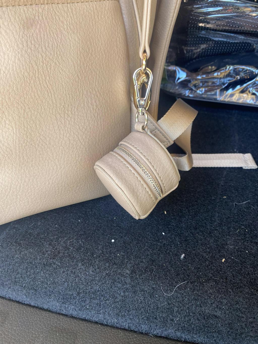 Crafted from premium vegan leather, this stylish and functional accessory features a convenient clip, allowing you to easily attach it to your bag.