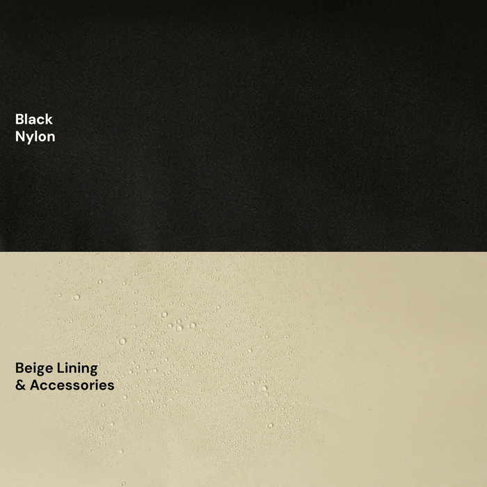 Made from black sateen nylon with a water-resistant finish, it’s durable and lightweight for all-day wear.